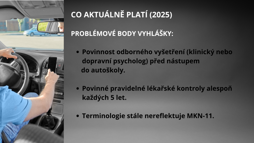 Pokud se vyhláška této změně nepřizpůsobí, omezení řidičského oprávnění se  nově dotkne i lidí s ADHD, s poruchami řeči a dalších skupin. Proto bude velmi důležité nadcházející legislativní úpravu pečlivě sledovat.
