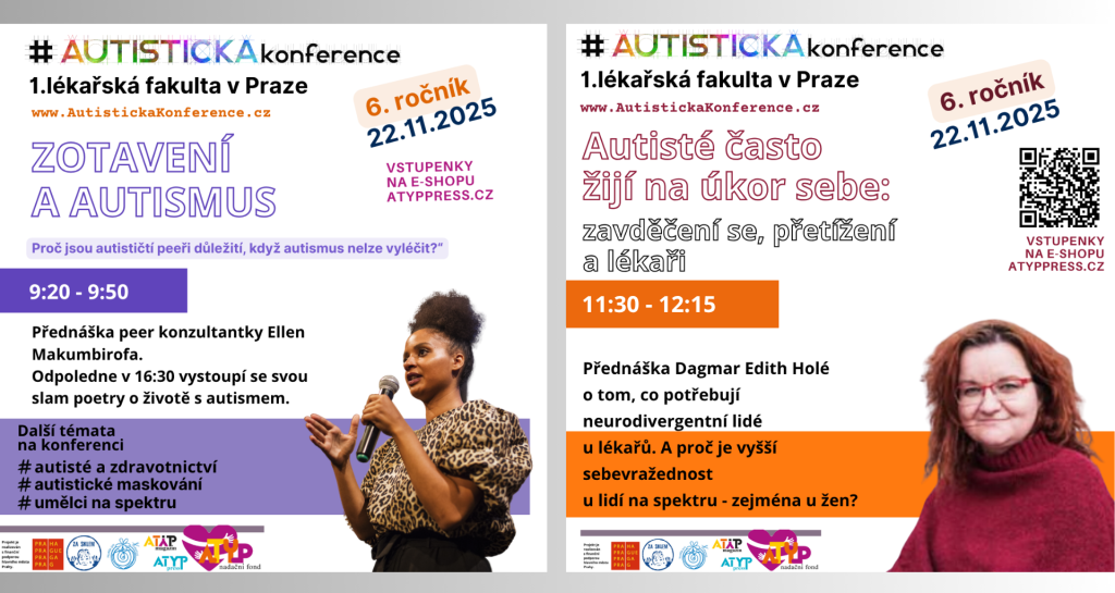 Ellen Makumbirofa se ve svém vstupu zaměří na otázku: Jak se můžete „zotavit“ z autismu, když autismus nelze léčit? Psycholožka Markéta Kavanová bude hovořit o autismu u žen. Ze Slovenska přijede AI Transformation Specialist Martin Kováč, který mluví o tom, proč považuje autistické myšlení za konkurenční výhodu v době umělé inteligence.